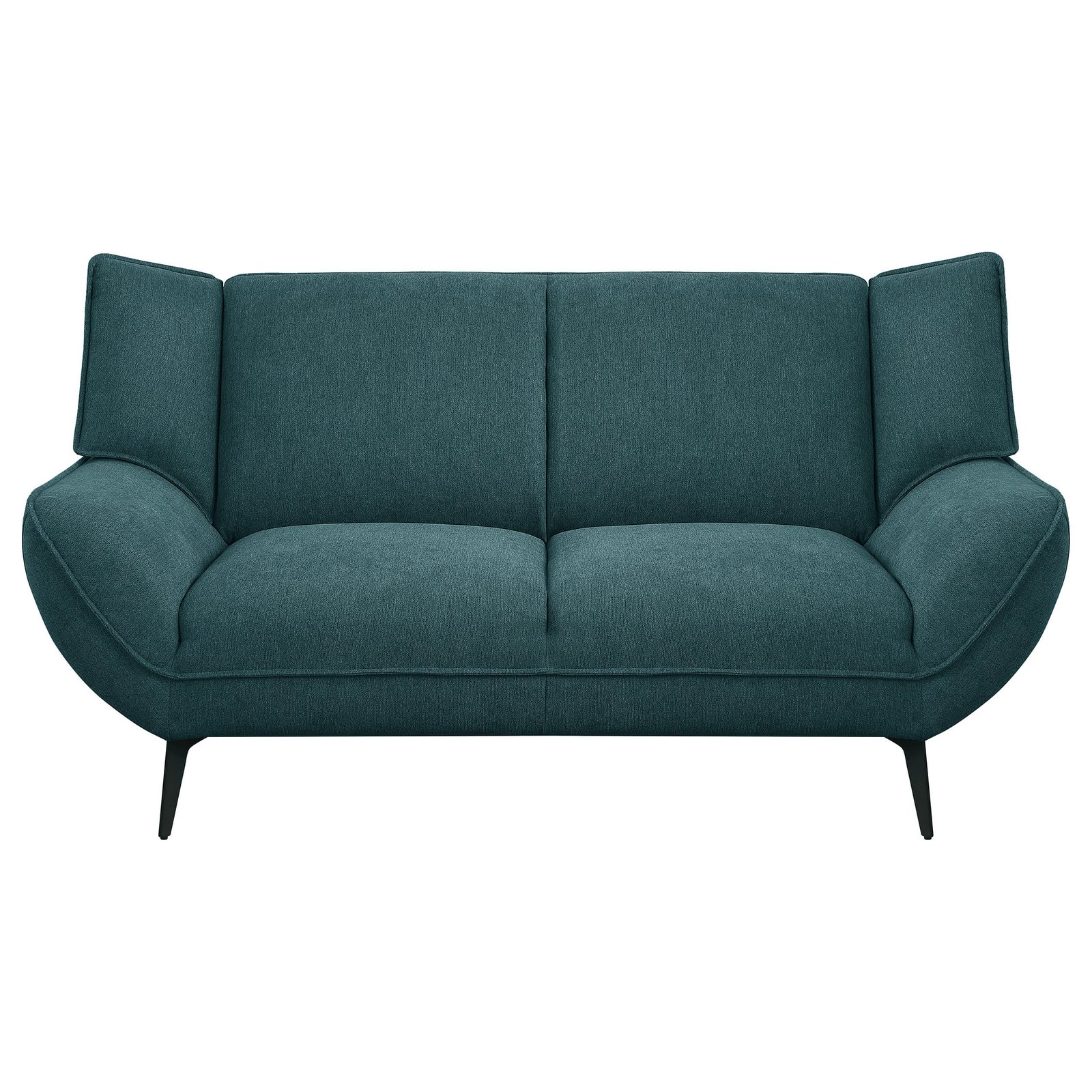 Infuse your casual living area with mid-century modern charm using this striking teal blue sofa set. Upholstered in soft, stylish fabric, it effortlessly blends comfort and visual appeal, offering a versatile palette for your decor. Flared arms and wingback accents integrate seamlessly with non-removable seat and back cushions, while tapered black metal legs provide modern contrast and sturdy support. Perfect for living rooms or family spaces, this set creates an inviting and contemporary seating experience.