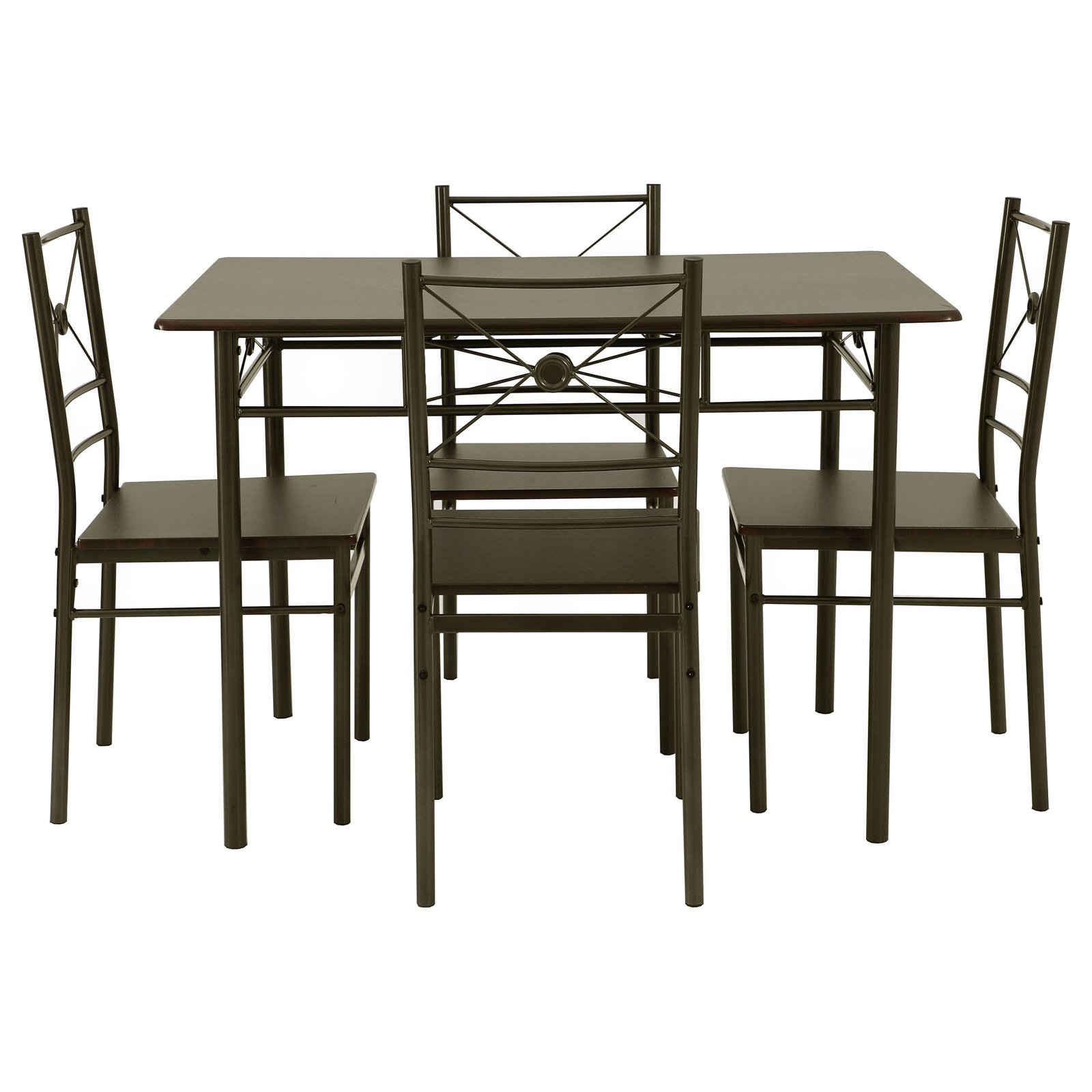 Bring style and practicality to your kitchen or breakfast nook with this elegant five-piece dinette set. Seating four, it features a rich dark bronze finish accented by a striking crisscross design and decorative circular details. Vinyl-topped table and chair surfaces make cleaning effortless, while a sturdy metal tubing frame ensures lasting durability. Perfect for quick meals or relaxed family dining, this set combines contemporary flair with everyday functionality.