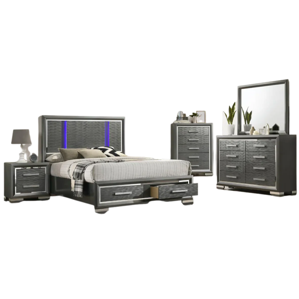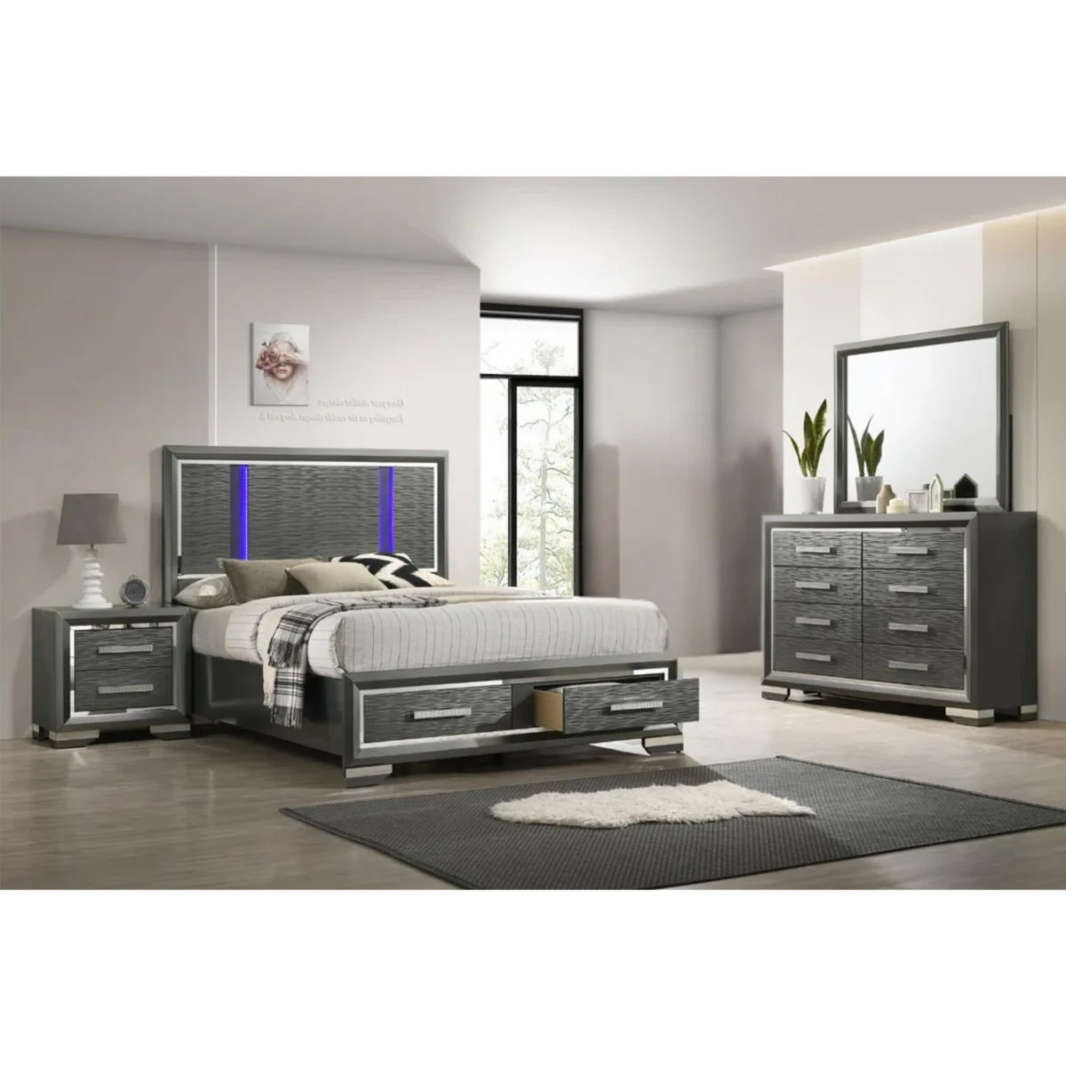 The Juliette Grey 4 Piece Bedroom Set combines modern elegance with practical design. Its metallic grey finish, paired with wave-textured panel,s gives visual depth, while the built-in LED lighting in the headboard creates ambient mood lighting.