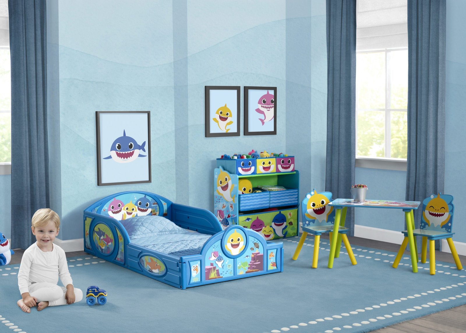 Doo-doo-doo-doo-doo your little one a favor and get them this Baby Shark Plastic Sleep and Play Toddler Bed with Attached Guardrails by Delta Children. Featuring colorful decals of Baby Shark and his family, this kids’ toddler bed will make a splash by inspiring a wave of sweet dreams. The bed’s low mattress height and built-in guardrails make it the best option for your child’s first big-kid bed, giving them the independence they crave while keeping them safe throughout the night. And that’s not all, the bed’s versatile plastic frame can also be used as a play enclosure or a ton of other fun things, like a ball pit (play balls not included). Get this toddler bed today and bring home the magic of Baby Shark!