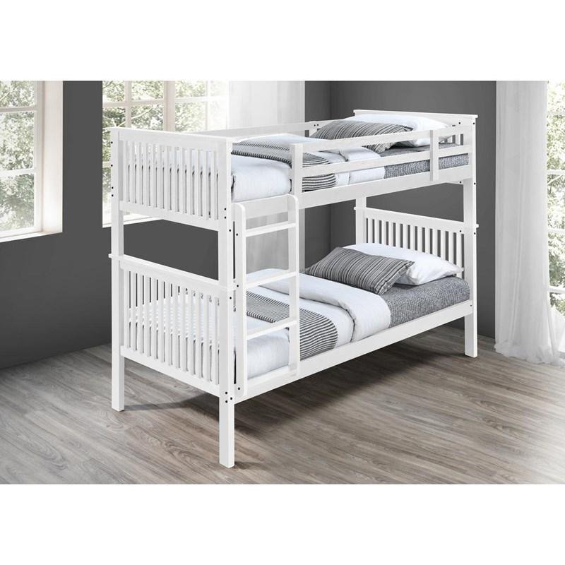 The Benji twin/twin bunk bed will make a great addition to your kids’ bedroom. It comes in a white finish and features a ladder, guard rails, and a mission-styled headboard and footboard.