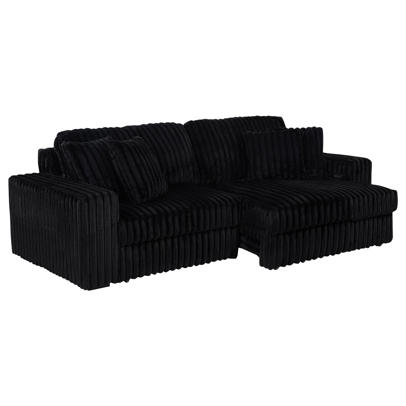 - Contemporary sofa set in black corduroy features deep channel tufting and dual power chaise design