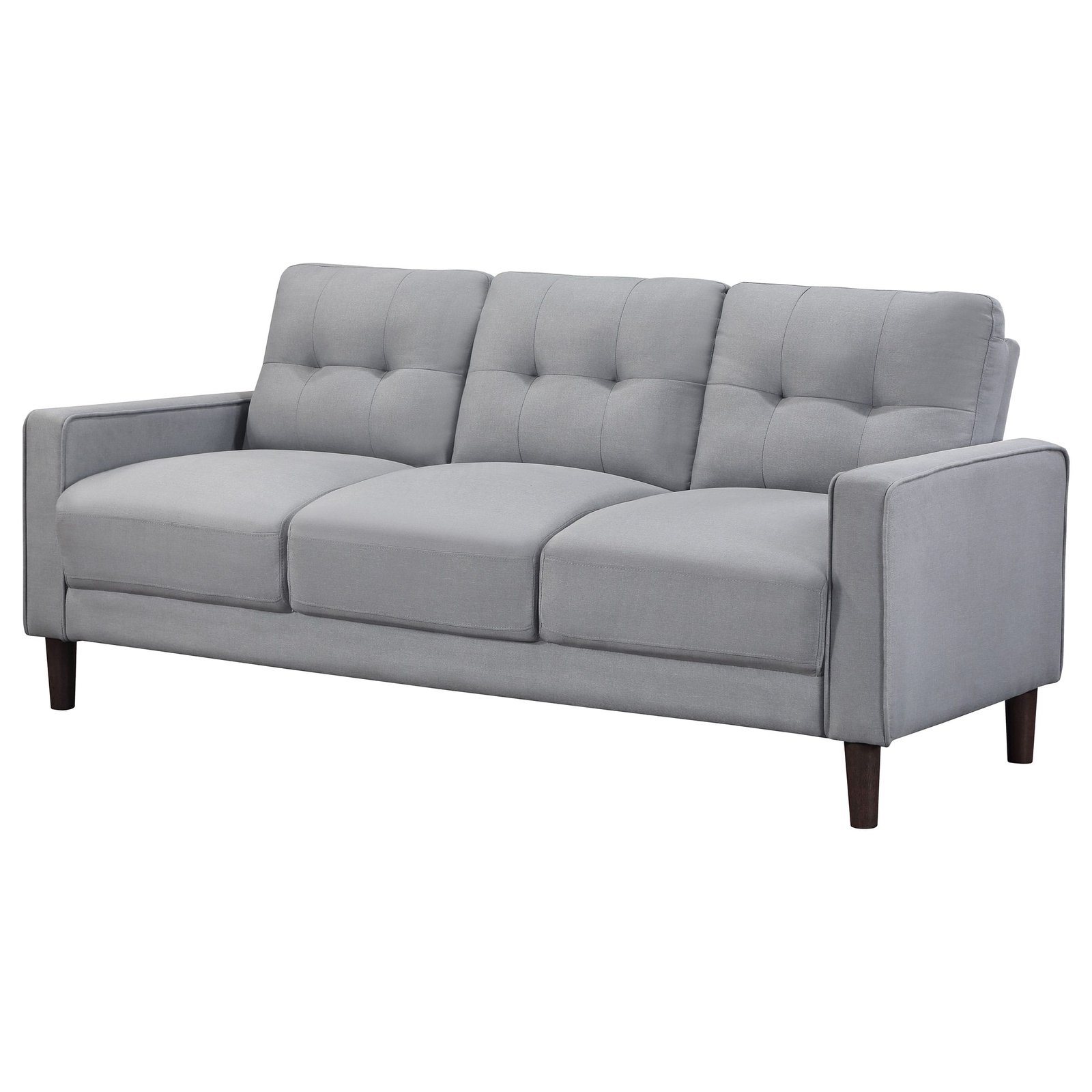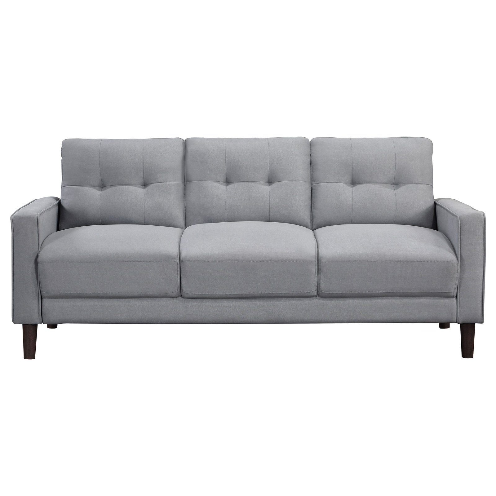 Crafted for compact spaces like studio apartments or small rooms, this sofa features a thoughtfully scaled design that blends style with practicality. Classic track arms and self-welt accents showcase its tailored finish, while grid-tufted back cushions and pocket coil spring seating deliver supportive comfort. Set on tall, round tapered brown legs, it provides both durability and a refined touch. Quick to assemble and upholstered in solution-dyed performance fabric, this piece offers easy care and everyday convenience.
