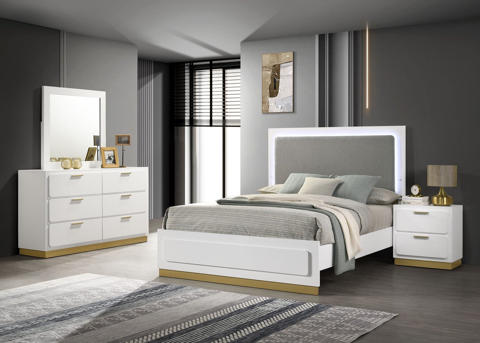 Transform your bedroom into a sleek modern retreat with this contemporary five-piece set. Designed with clean lines and a stylish two-tone finish, each piece is accented with metallic kickplates and bar drawer pulls for added dimension. The bed stands out with its upholstered headboard in light gray fabric, softly padded for lounging comfort, and framed with built-in LED strip lighting controlled by a touch switch for effortless ambiance. A low-profile footboard enhances the airy, streamlined design, while multiple storage drawers across the set provide ample space to keep your essentials organized in style.