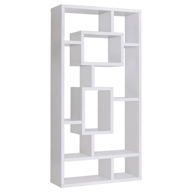 Put your most cherished memories on proud display. This bold bookcase features ten shelves of various sizes to show off your favorite keepsakes. With expert craftsmanship and high-quality materials, it provides safe, sturdy storage. Its cool, contemporary silhouette adds artsy appeal to a room with its striking, geometric shapes. This bookcase is available in white, cappuccino, or weathered grey for a variety of options to fit any decor.