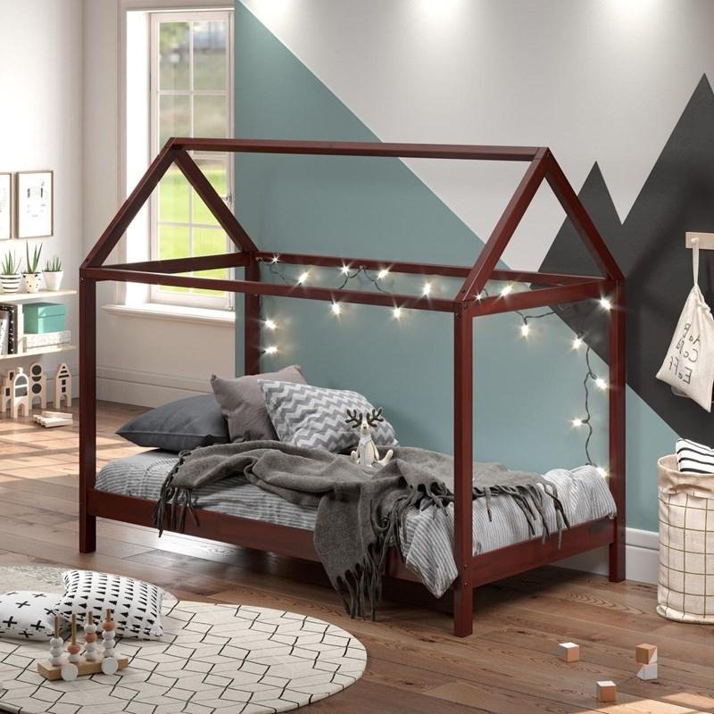 This Cottage canopy bed features a shape of a little house and an espresso finish.