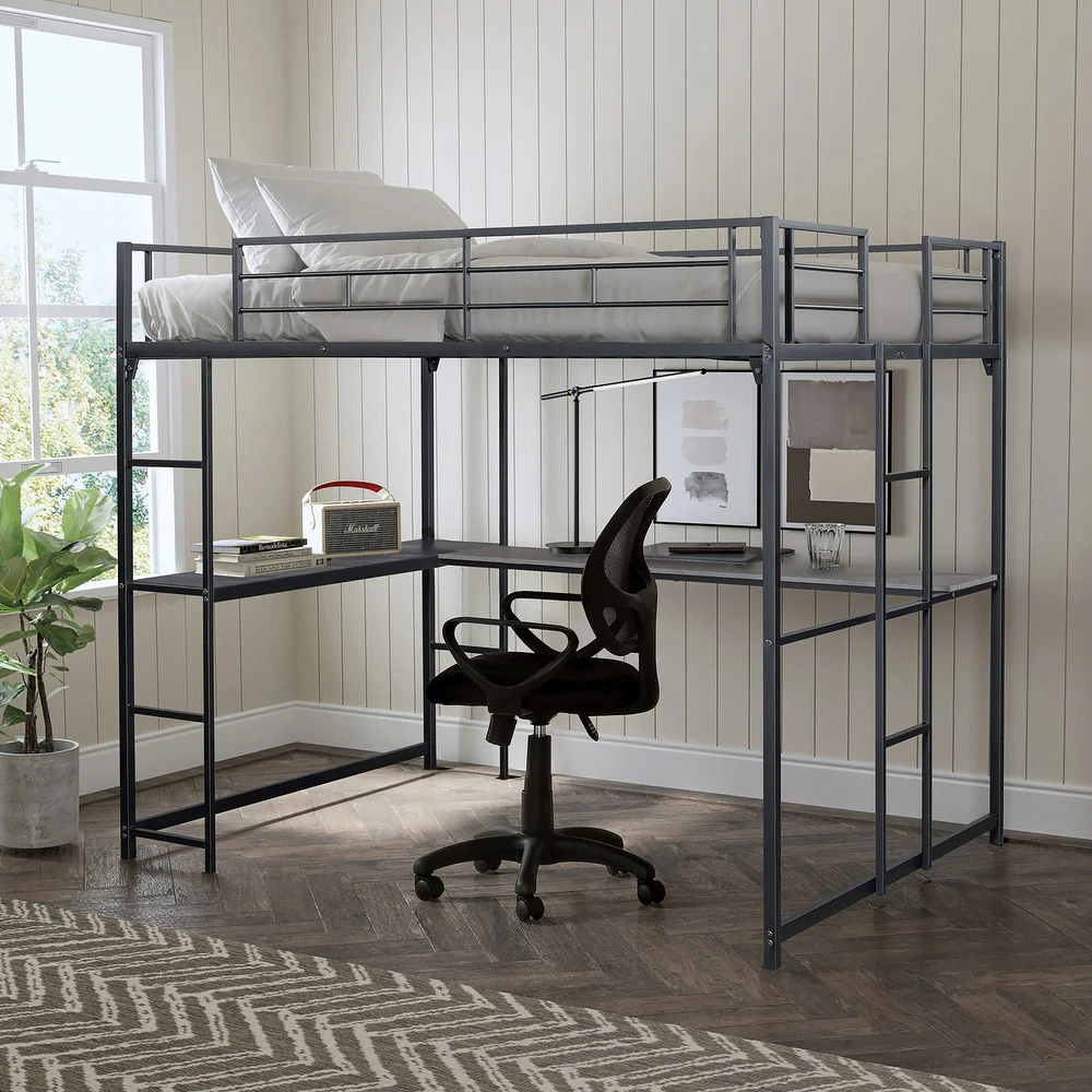Metal Full Loft Bed with Built-in L-shaped Desk Workstation in white — durable metal frame, full size, perfect for study + sleep combo. Compact design, modern style.