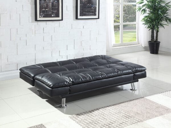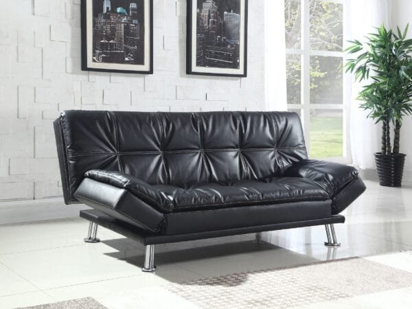 The Dilleston collection presents this black sofa bed, blending style and comfort for your living or family room. Plush pillow-top seating and adjustable armrests provide relaxing support, while black leatherette upholstery with button tufting and contrasting white stitching adds a modern touch. Also available in white, brown, and grey leatherette, this sofa bed pairs beautifully with a matching chaise and storage ottoman (sold separately) for a coordinated and stylish setup.