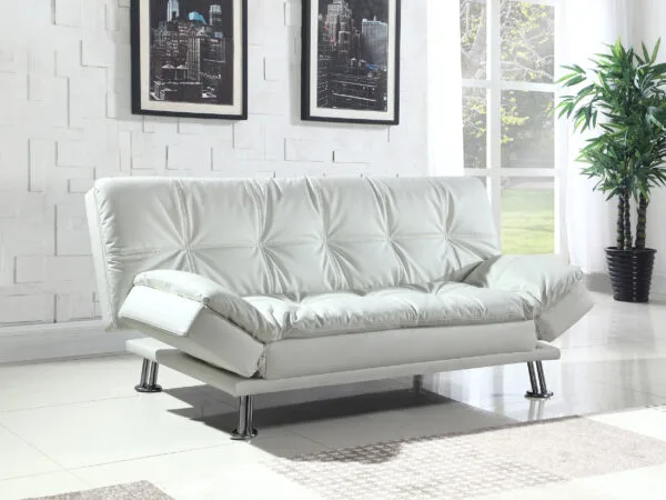 The Dilleston collection presents this white sofa bed, combining style and function for any living or family room. Plush pillow-top seating provides comfort for lounging, while adjustable armrests let you rest your arms or head as needed. Upholstered in white leatherette with button tufting and quality stitching, it complements a variety of decor styles. Also available in brown, black, and grey leatherette. Matching chaise and storage ottoman sold separately.