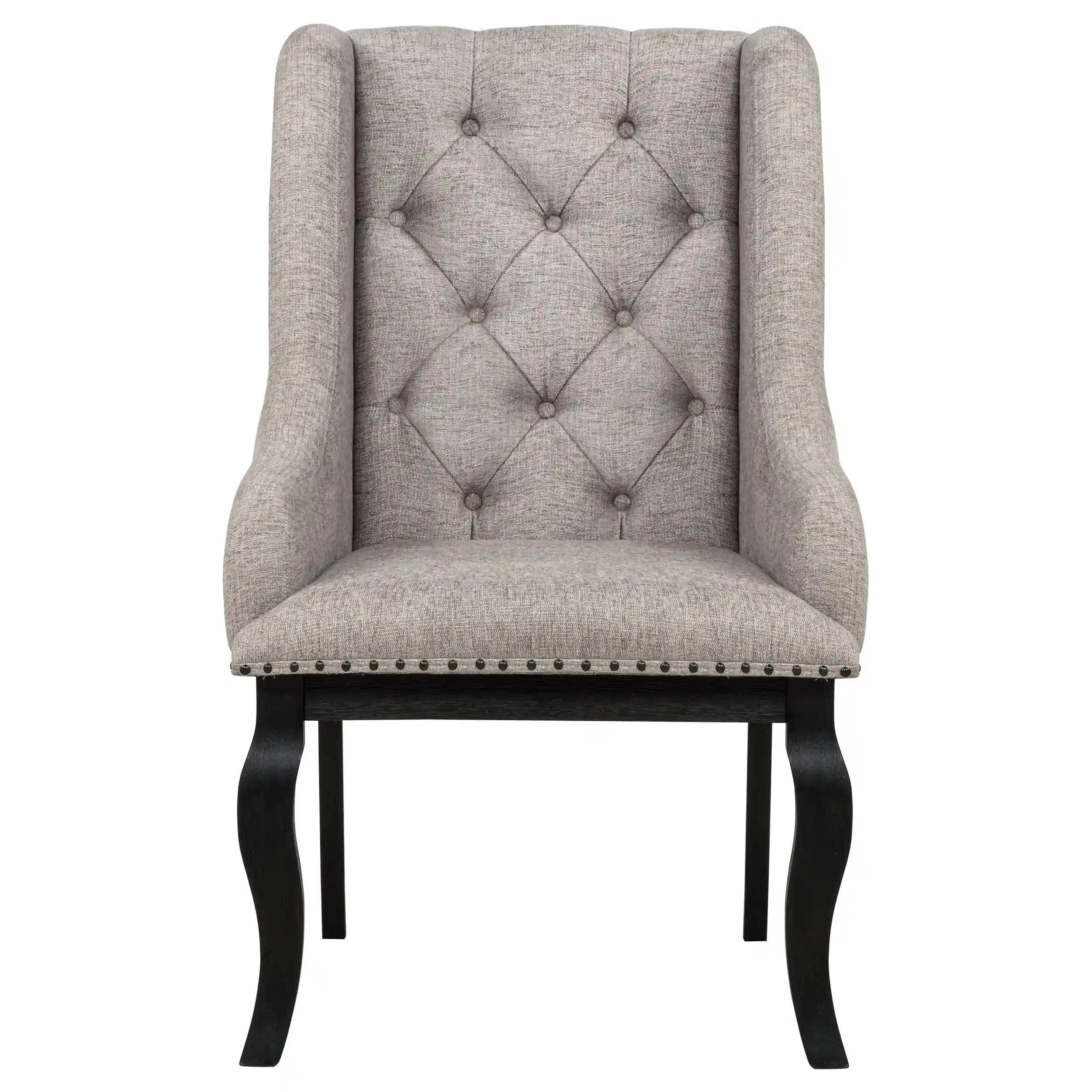 Upgrade your dining space with the Phelps Upholstered Dining Chair with Arms in Tobacco and Distressed Noir. Featuring rich upholstery, supportive armrests, and a bold distressed finish, this chair blends comfort and modern elegance—perfect for stylish, everyday dining.