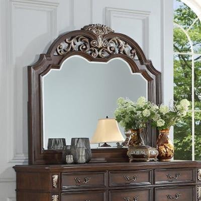 The Empress Dresser Mirror will make a great addition to your bedroom. It features a Cherry finish with brushed gold accents, and decorative scroll insert.