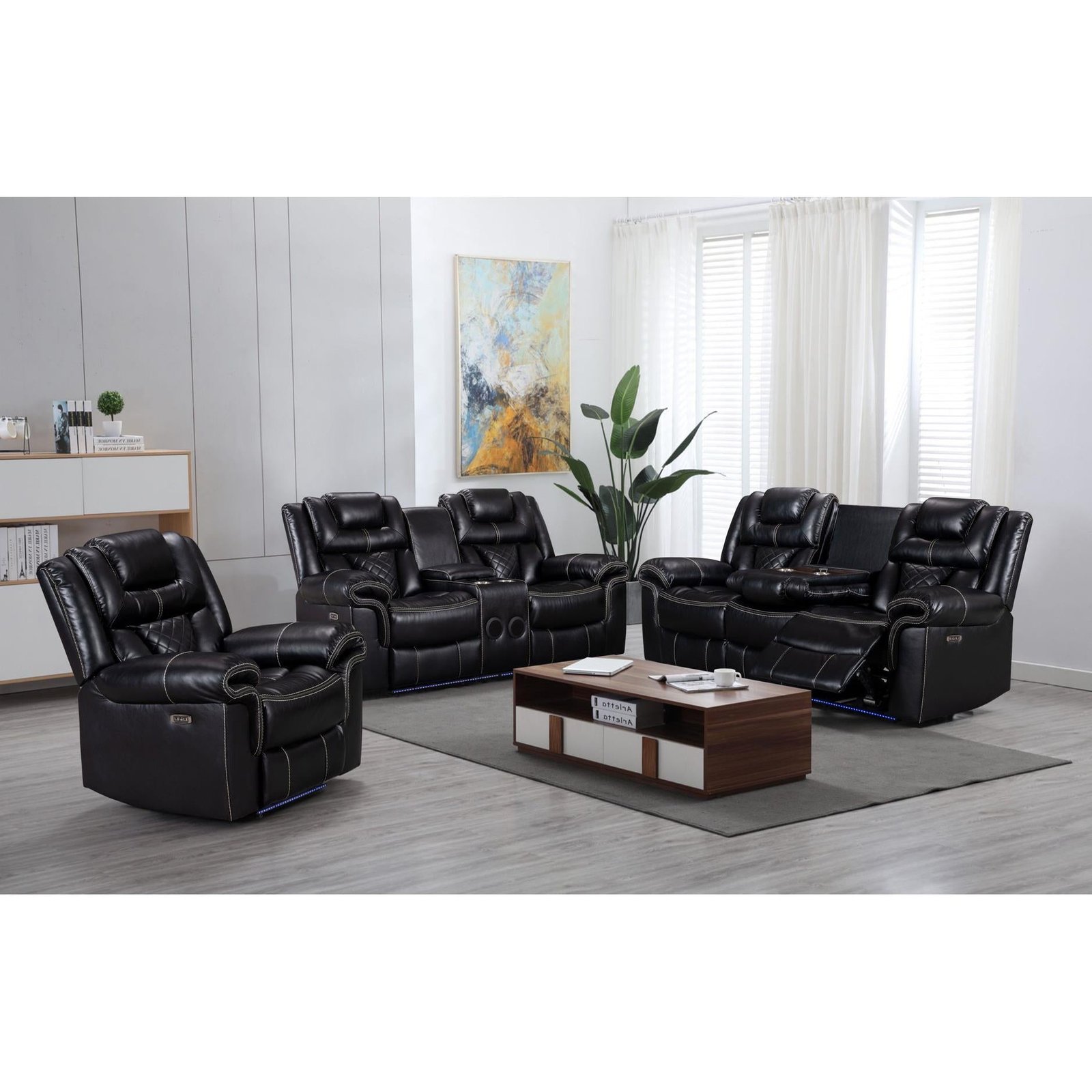 Power motion, LED lights and speaker on loveseat console. Sofa with LED lights and drop down tray and wireless charger,
