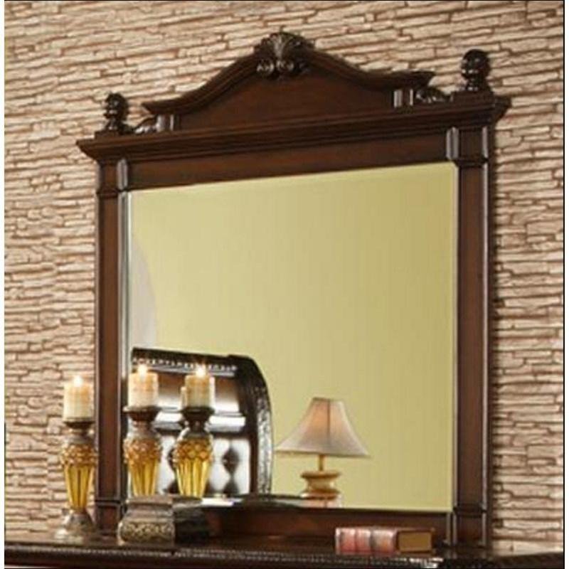 The Hemingway dresser mirror features a rich cherry finish. This piece will sure bring style to any bedroom. It features a pediment top and finials.