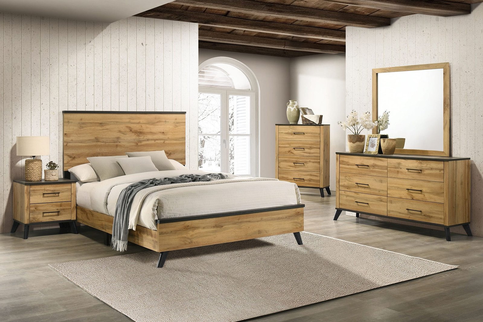 - Queen-size bed showcasing a rustic wood grain with mid-century modern flair