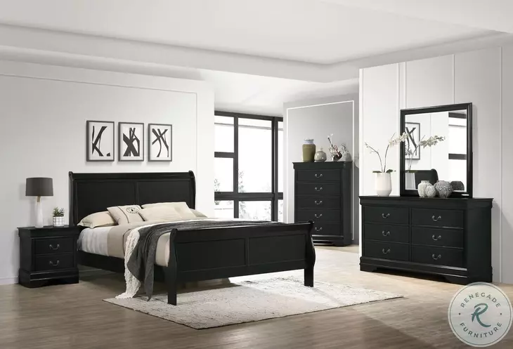 Elevate your bedroom with the Louis Philippe 5-Piece Eastern King Set. Features a warm cappuccino finish, solid hardwood and veneer build, and classic silver bail handles. Includes bed, dresser, mirror, nightstand, and chest — stylish storage in one elegant set.