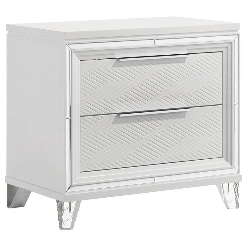 Complete your bedroom ensemble with this elegant 2-drawer nightstand, designed with a modern Italian aesthetic. The white finish, accented with mirror framing and polished chrome metal hardware, creates a striking look. Featuring picture framed recessed panels with an embossed herringbone graphic pattern, this nightstand offers both style and functionality. The top drawer includes cord management access, making it perfect for your rechargeable devices. Crafted from Asian hardwood, MDF, and mirror, this nightstand is a luxurious addition to any bedroom.