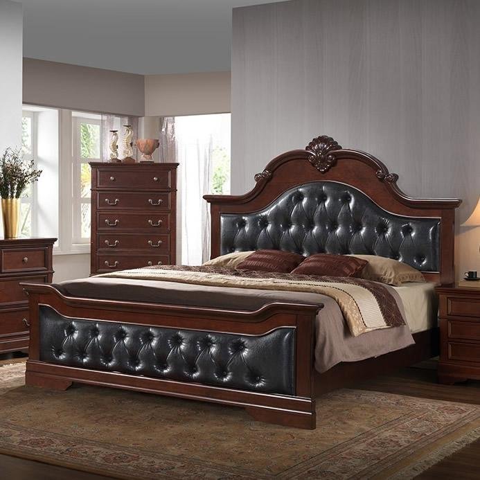 This Sonesta Grande upholstered bed features a button-tufted headboard and footboard, crowned top headboard, and a dark walnut finish.