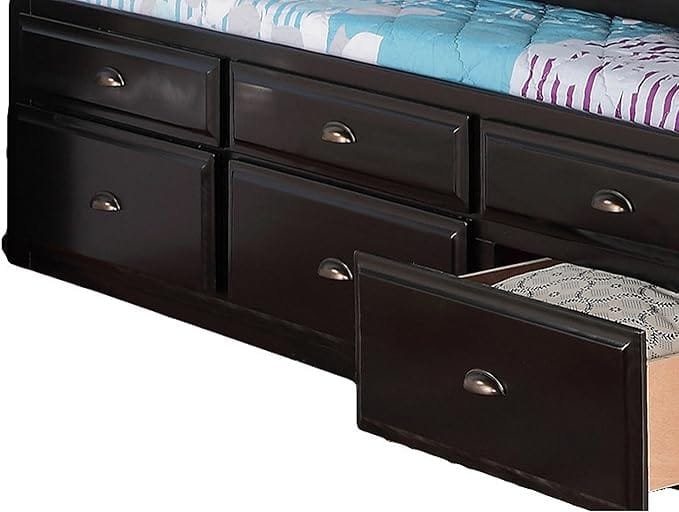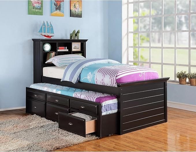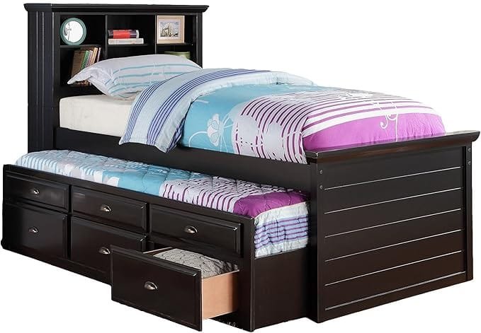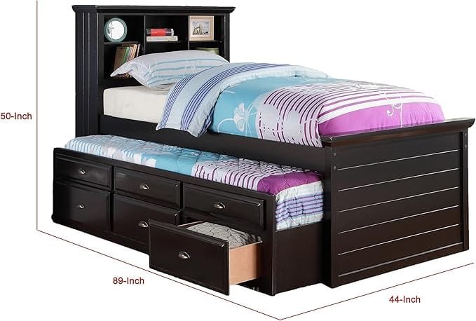 Benjara Toni Twin Size Trundle Bed in sleek black finish, featuring a bookcase headboard, six spacious drawers, and a pull-out trundle for extra sleeping space. Stylish and practical — ideal for modern bedrooms.